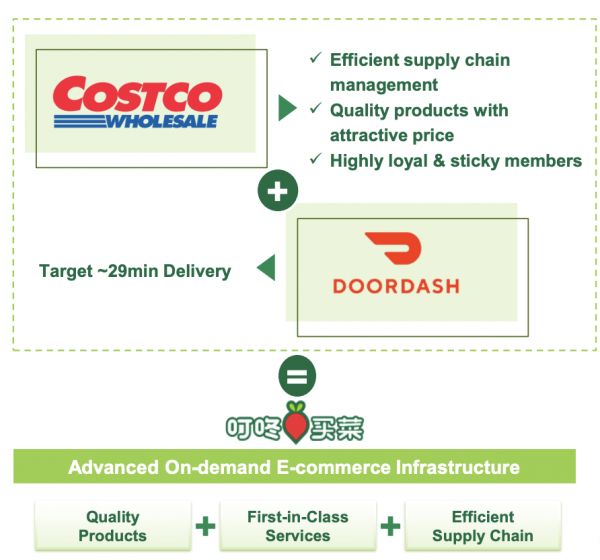 而叮咚买菜则借用了时髦的网红品牌公式自比,说自己是Costco+Doordash的结合——Cotsco代表了高效的供应链管理体系、高性价比商品,以及高粘度的消费者;而美国最大外卖平台Doordash的优势,则是29分钟送达的确定性履约能力。