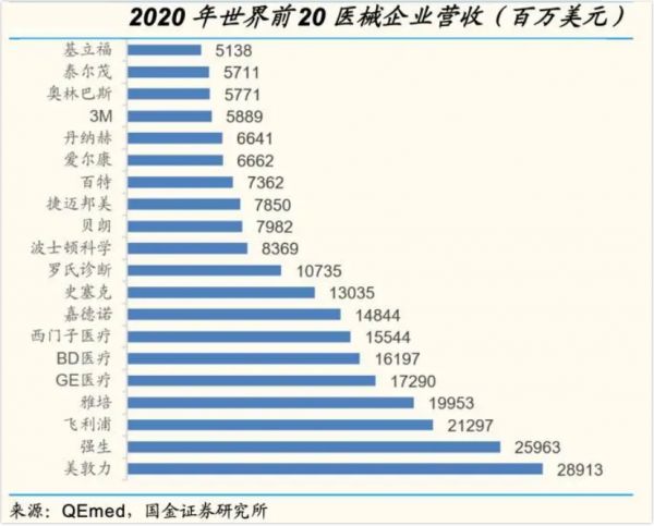 尽管在国内优势明显,和国际巨头相比,迈瑞同样还不够强大。2020年迈瑞营收210.26亿元 (约32亿美元) ,全球排名第34。