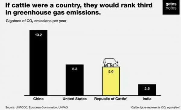 顶尖富豪比尔•盖茨也特别关注牛屁问题,他曾多次为此撰写文章,称假如全球养殖的牛组成一个国家,它们将在所有国家碳排放中名列第三,仅次于中国、美国,比世界上所有使用燃油的交通工具的碳排放总和还高。
