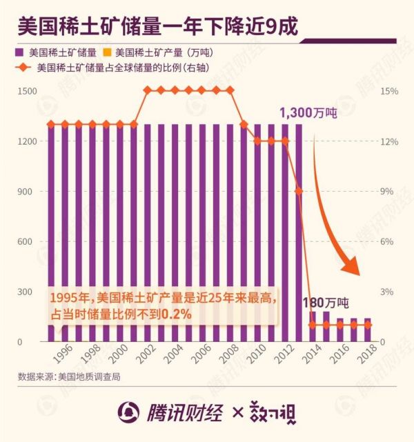 但2003到2011年,美国几乎不产稀土啊。要知道,25年来,即便是产量最多的1995年,该产量占储量比例也不到2%。不过即使不产,稀土矿储量还是一年骤降86%。