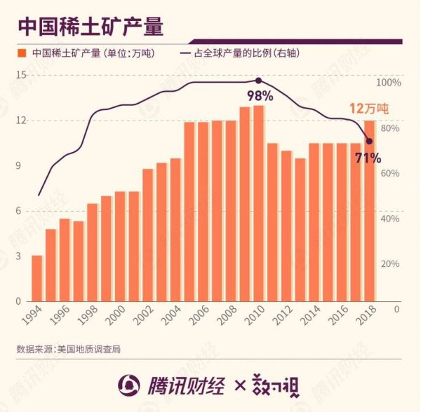 也正是那时候起,中国成了全球稀土粉丝的后援军,产量持续上升,占全球比重也一度高达98%,抱住土豪的大腿。