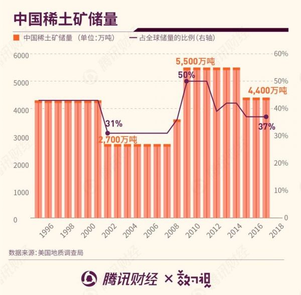 同时,美国地质调查局还公布了中国储量数据,2018年4400万吨的储量占据全球37%的比例,这还是在疯狂开采之后下降的比例,该比例曾一度高达50%。