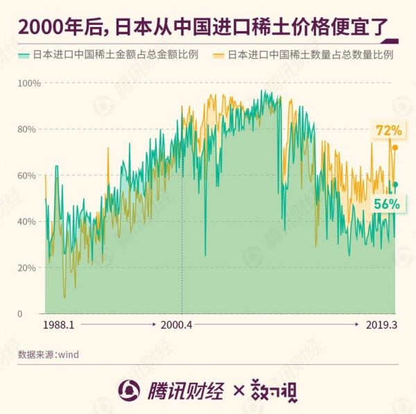 以中国出口稀土最多的国家——日本为例,2019年3月,日本从中国进口的稀土数量,占它全部进口量的72%。但日本掏给中国的钱,却只占全部稀土进口金额的56%。