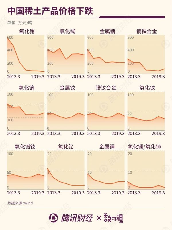 同时,稀土一系列产品的价格从1万元/吨到百万元/吨不等,但几乎每种产品价格均在下降。