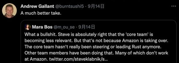 Steve Klabnik 认为亚马逊雇佣多名 Rust 维护者和贡献者的行为是在“侵蚀 Rust 团队”、“将核心团队边缘化”。Rust 库团队负责人 Mara Bos 则对此完全反对:“胡说什么!核心团队的确是愈发无关紧要,但这并不是因为亚马逊正在接管,而是核心团队已经不再真正地指导或领导 Rust 了。”