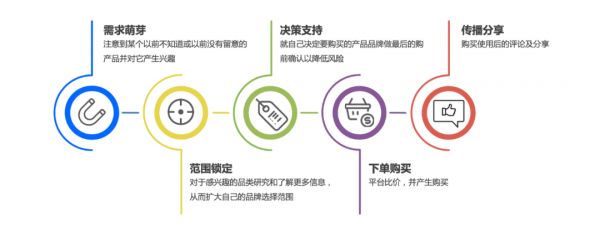 凯度将消费者的消费链路分为五个主要阶段,分别是:因兴趣而对某类产品生成消费需求——萌芽阶段;在产品所属的大品类信息内容中去做了解,以便扩大并明晰界定品牌所选范围——范围锁定;随着对产品品牌的聚焦,更深入地去研究相对应的产品,做最后购买前的确认、下决策——决策支持;确定所购产品后,去多平台上比价,最终去购买——下单购买;在平台上评论、分享产品使用体验——传播分享。