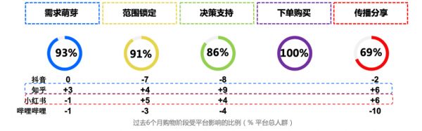 品牌方在内容营销时会发现,不同风格的内容平台之所以对消费决策有各自不同的影响作用,根本原因在于抖音、知乎、小红书、B站这些内容平台在消费全链路的五个阶段中的效果表现也各自不同。