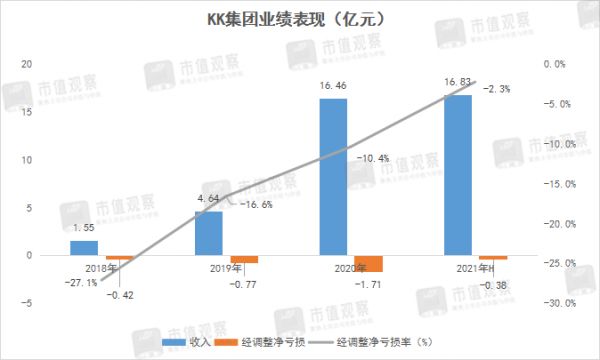 因此,KK集团的报表呈现出的是:营收增长迅猛,但同期净亏损反而还明显好转。截至今年上半年,公司营收翻了数十倍,经调整后的净亏损仅为0.38亿元,经调整净亏损率进一步收窄至-2.3%。