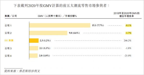 据弗若斯特沙利文报告,按GMV计算,2020年国内前五大潮流零售参与者的总市场规模为305亿元,仅占中国潮流零售市场GMV的约15.6%,这其中KK集团以1.2%的份额排名第三。