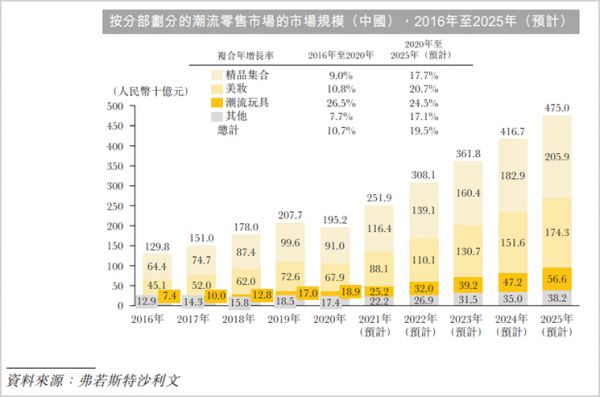 根据弗若斯特沙利文报告,按GMV计算,潮流零售市场规模从2016年的1298亿元增至2020年的1952亿元,复合年增长率达10.7%。据估计,2025年按GMV计算的市场规模将达到4750亿元,2020年至2025年的预计复合年增长率将为19.5%。