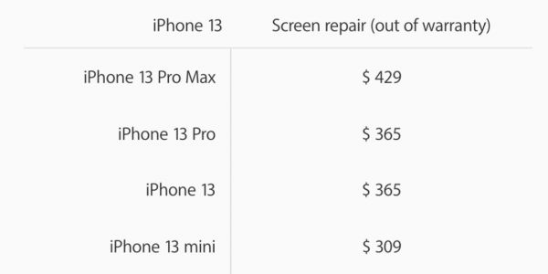 苹果美国官网上iPhone 13系列的屏幕修理费用