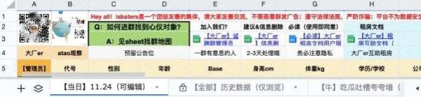 而另一个份《大厂er相亲文档》是实现了阶段性开放编辑权限,所有人都可通过链接打开,不同的sheet中有多个类别。在开放限权时,用户可以同时在线,根据类别直接填写,其中也包含了二维码指向等引流导向。