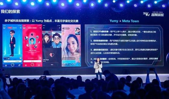 那赤子城在做什么?Yumy是我们一款海外的社交产品,目前下载用户数是3000万,我们会先以Yumy为起点,不断丰富社交元宇宙的元素。其实几乎所有社交玩家布局元宇宙的第一步,都是从虚拟形象切入,比如说刚刚SOUL也提到了。我们也一样,会先探索社交元宇宙的虚拟形象,会上线自定义3D虚拟形象的功能。用户可以上传个人照片,通过AI算法识别,一键生成和自己相貌匹配的 3D 动态虚拟形象,并可全方位编辑、定制该形象。另外,用户定制的3D虚拟形象可以和真人进行传神的实时表情同步,即用户可动态扮演自己的虚拟形象。简单来说,我们的虚拟形象不是毫无依据的虚拟,还是会让用户做有限的修改,这样会更有真实度,是真实中的虚拟,可以提高陌生人在交互之间的信任度。