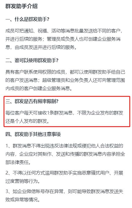 11月19日,企业微信最新版本(iOS 3.1.20)悄悄也解锁了一个新功能,即每位客户每天可接收1条群发消息,不限企业发布还是个人发布。也就是说企业「群发助手」每月给客户和客户群的群发次数增至30次!此前企业每月只可给客户、客户群群发4次,群发次数提升7倍+!