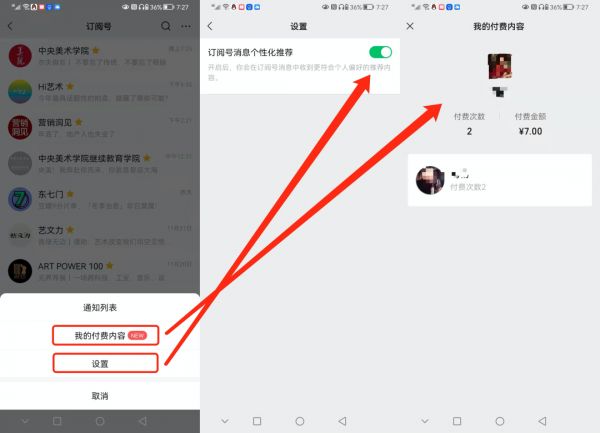 此外,如上图所示,点击订阅号右上角,会有两个新发现:一是新增“订阅号消息个性化推荐”,开启后会收到更符合个人偏好的推荐内容。关闭后可能并不会减少系统推荐的内容数量,只会降低内容与用户偏好的相似度。二是新增“我的付费内容”,点击后可看到用户付过费的文章,此举或可表明,微信下一步会继续培养用户打赏优质内容的习惯,其内容形式不仅是文章,也有可能是短视频。