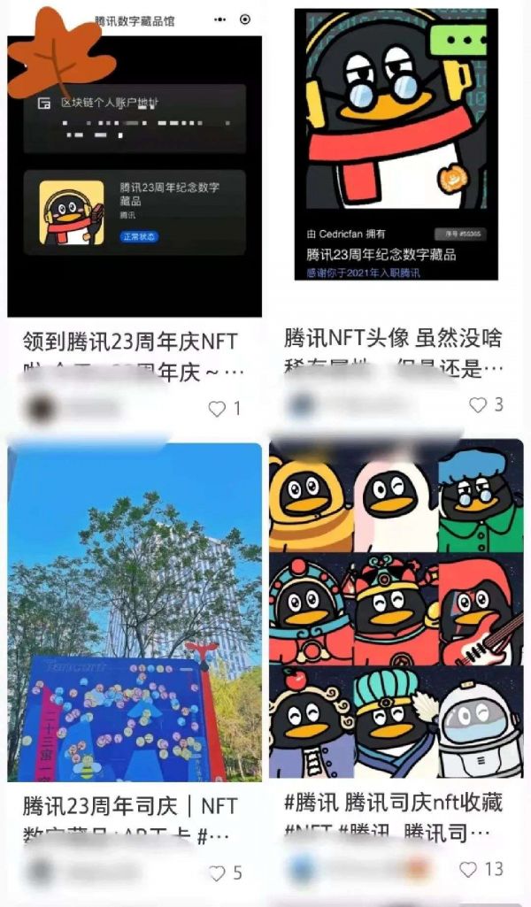 第二天是腾讯公司成立23周年的生日。腾讯向全体员工赠送7.2万份NFT数字藏品,由QQ企鹅形象搭配不同元素组成。有传言称,某些隐藏款在私下交易中卖出了5万元的高价。