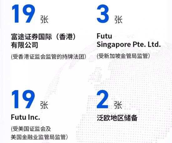 对于跨境互联网券商来说,金融牌照是核心资产,也是全球化布局的第一道“护城河”。目前,富途控股在香港、美国、新加坡、欧洲等地积累43张牌照及会员业务资格。