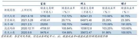 由于暗盘交易属场外交易,不是通过交易所交易系统,而是通过券商内部系统报价撮合交易,因此流动性和收报价格是投资者选择券商打新的重要考量。从流动性来看,辉力是最早拥有自研暗盘的老牌券商,吸引了很多券商接入其暗盘交易系统,富途在交易额方面与辉力尚有差距,但高于耀才和一通。从暗盘收益率(暗盘收盘价/招股价)来看,富途也具有一定优势。