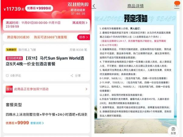 然而,林晓并非完全没有任务在身,她和男友需要盯着点抢购一件商品,即出境游的套餐。在这之前,林晓从一个好友群内看到了一项马尔代夫5天4晚一价全包酒店套餐的特价活动,提到的这家酒店为2021年开业不久的滑梯酒店,套餐内包括住宿以及出海活动、餐厅酒吧等等,“双11”的券后价格为9999元。
