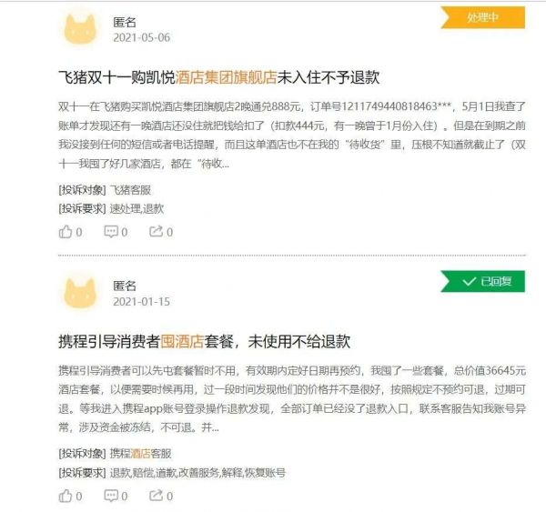 事实上,杉杉的遭遇也并非个案。在黑猫投诉上,也有消费者在2021年1月发起类似的投诉称,“去年双十一的宣传引导客户去购买特价酒店套餐,按照惯例旅游平台囤的套餐都是不预约可退,过期可退,该酒店引导客户去囤,但是不支持不预约可退和过期可退规则。”