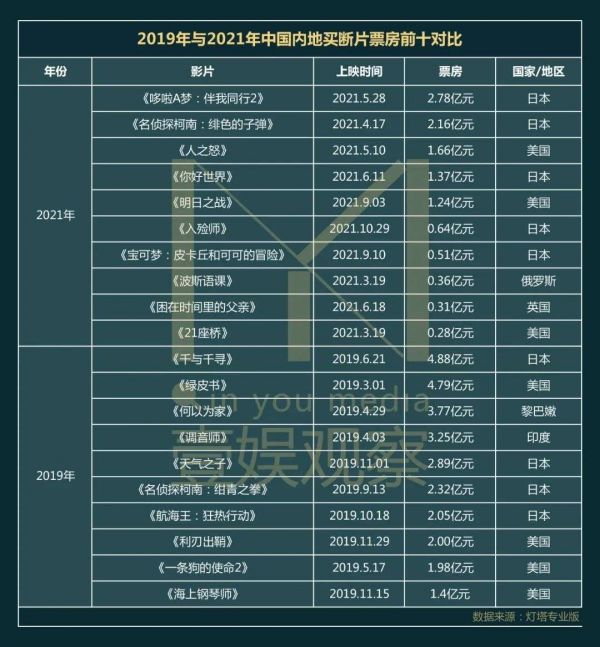 据灯塔专业版数据,2021年只有《哆啦A梦:伴我同行2》《名侦探柯南:绯色的子弹》获得2亿票房,《人之怒》《你好世界》《明日之战》获得过亿元票房,全年仅有不到40部买断片上映,累计票房不足15亿元,其中有23部影片低于千万票房。