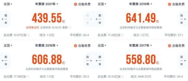 与此同时,2021年内地电影票房也终于在全年接近尾声时突破了439亿元,缓缓赶超2015年的438亿元(不含服务费),而距离超过2017年的558.8亿元希望渺茫,2021年全年突破500亿元票房成为最后坚守。