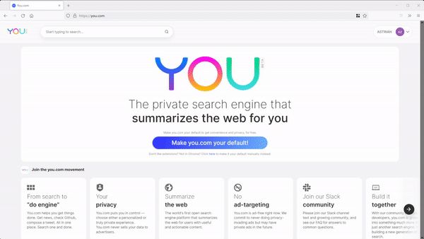 从首页开始,You.com 就与传统的搜索引擎有着天壤之别。他们在首页会推荐你将 You.com 设为默认搜索引擎,并在下方描述他们的愿景,而搜索框则被挤到了左上角。而在前几天,他们的首页与 Google 等传统搜索引擎没有什么差别。也许是因为他们发现绝大部分人都从浏览器搜索框发起搜索,才做的这样的改变。