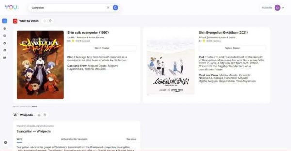 根据搜索关键词不同,You.com 会展示的 search-app 也有所差异,结果形态也依此有所差异。例如,搜索诸如「Evangelion」(新世纪福音战士)等影视关键词,会出现「What to Watch」,展示 Evangelion 的相关作品和评分;还有对应的 Reddit 帖子和社区讨论。