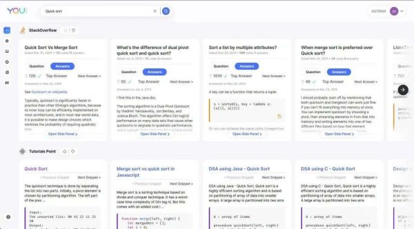 尝试搜索「Quick Sort」(快速排序,一种排序算法)等与算法相关的关键词,You.com 会将一些技术网站的资料作为 search-app 放在搜索结果的上面,直接点击还能在右侧的弹出窗口中直接查看关键信息。不仅如此,它还会尝试帮你生成几段对应代码。(虽然看得出来它尽力了,不过它生成出来的可能真的不是代码……)