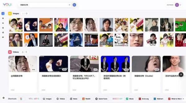 作为手游玩家,想找一下制作人的梗图?把他的名字丢到 You.com 里,比如搜索「海猫络合物」,你就能看到很多相关的梗图和有趣视频。