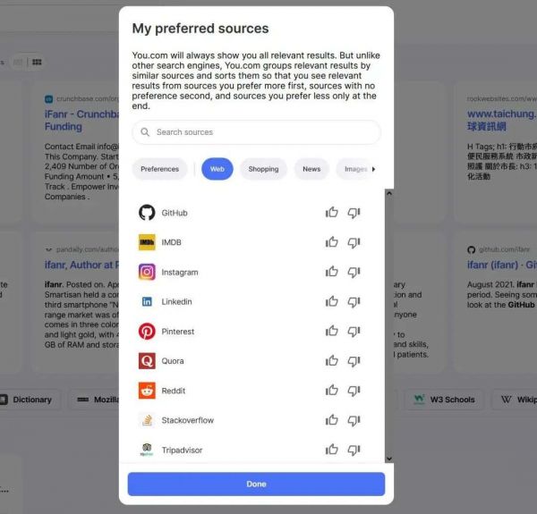 刚开始从其他搜索引擎转移到 You.com 的确会有「水土不服」的情况,造成这个情况的主要原因自然是 You.com 的排版与排列与传统搜索引擎有巨大差异:以往只需要往下拉就能一目十行,现在不仅要横着拉,而且眼睛扫的方向也会有所不同。