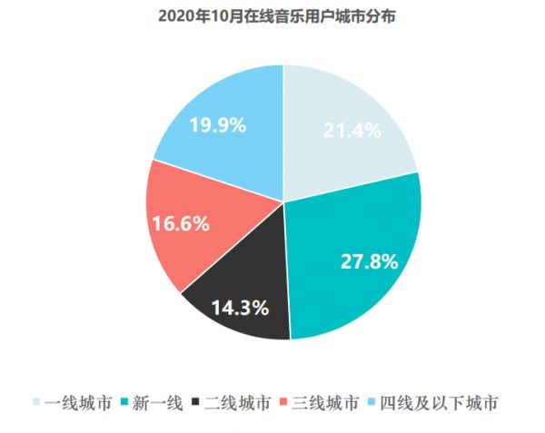 极数发布的《2020年中国在线音乐行业报告》显示,网易云音乐的用户群体中,一线及新一线城市用户占比为41.8%,这个比例远超腾讯音乐的26.7%,此外,数据显示,在线音乐付费用户中,49.2%的付费用户来自一线城市和新一线城市。