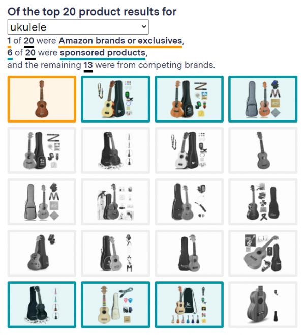 我们在今年1月通过亚马逊平台搜索“尤克里里”时,结果列表出现的前20个产品中,亚马逊自有品牌或独家品牌产品有1个(橙色框),标注“商品推广”的产品有6个(蒂芙尼蓝色框),同类竞争品牌产品有13个(浅灰色框)。