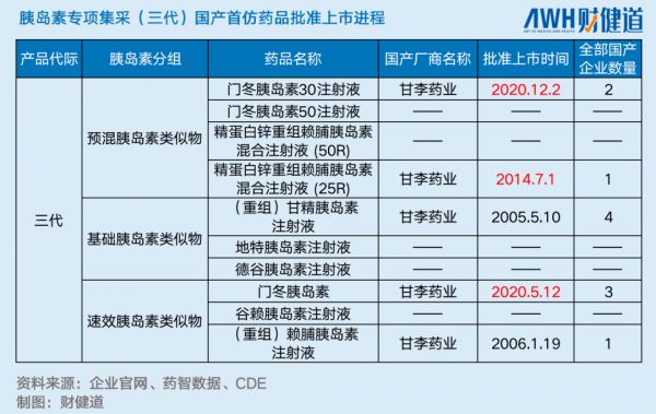据统计,中国本土三代胰岛素产品,早在2005年,只有甘李药业的一款“甘精”(三代基础胰岛素类似物),到2006年增加一款“赖脯”(三代速效胰岛素类似物)、2014年增加一款“赖脯混合”(三代预混胰岛素类似物)。