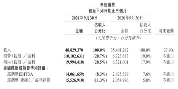财报数据显示,美团三季度营收488.3亿元,超市场预期的485.7亿元,同比增长37.9%;经调整亏损净额55.27亿,超市场预期的亏损52.4亿元,去年同期为盈利20.55亿元;第三季度期内亏损99.9亿元,超市场预期的亏损70.4亿元,亏损金额为2018年第三季度以来最大。