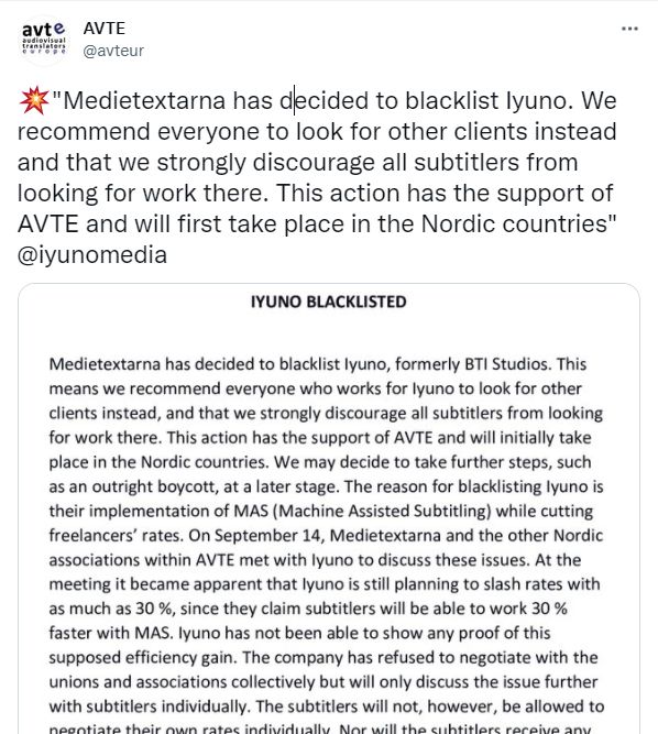 欧洲试听翻译协会(AVTE)在Twitter上宣布将Iyuno-SDI公司拉入黑名单。图片来源:Twitter @avteur