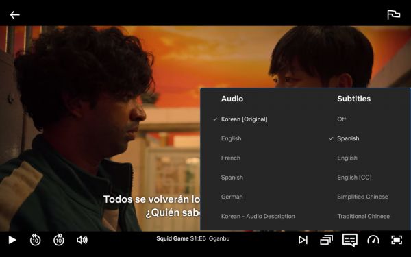 在播放《鱿鱼游戏》时,视用户语言设置选择,Netflix可以为订阅用户提供31种不同的语言字幕选项,以及13种不同的配音版本。