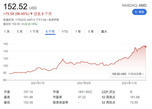 过去的六个月里,AMD的股价几乎翻了个倍。据AMD Q3财报显示,AMD在刚过去的第三季度收入同比上涨了54%,达到43亿美元;经营性收入则同比上涨了101%,超过10亿美元。