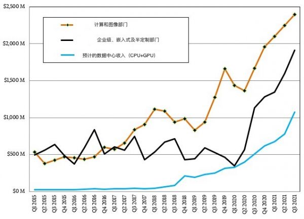 2021 Q3 AMD计算和图像部门与企业、嵌入式以及半定制部门收入占比为56%和44%,虽然企业、嵌入式和半定制部门收入占比相对较小,但数据中心市场的持续的需求让该部门的营收一直保持着强劲的增长。