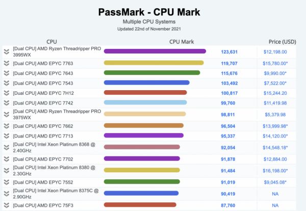 AMD CPU近年在服务器市场的强劲表现得益于其性能的良好表现和具有竞争力的性价比。根据PassMark上的跑分排名,在多线程的性能上AMD的EPYC处理器占据了前列,同时价格也更低。