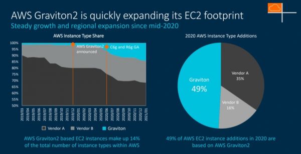 2019年,Arm公司为服务器产品推出的核心IP Neoverse N1,基于这一技术,亚马逊网络服务(AWS)开发了自研服务器芯片Graviton2。AWS表示与基于M5的实例比较,使用Grvtion2的实例成本降低了20%,性能提高了40%。截至2021年,Graviton2的实例占了AWS应用实例的14%,在2020年AWS增加的实例中有49%是基于Graviton2。