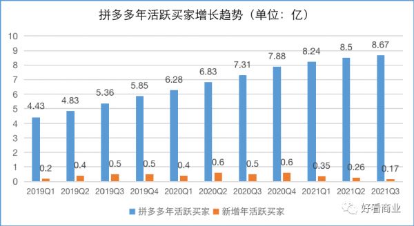 今年前三季度,阿里、京东、美团都在拓展用户,增长可观。相比这三家,拼多多今年前三季度新增年活跃买家数量最少。