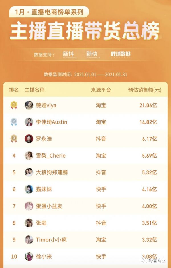 薇娅、李佳琦崛起于淘宝直播,目前他们仅在双十一的GMV就达到百亿元规模,是国内电商主播中绝对的头部。罗永浩是抖音电商的标杆,而辛巴家族则长期占据快手直播电商的头部位置。
