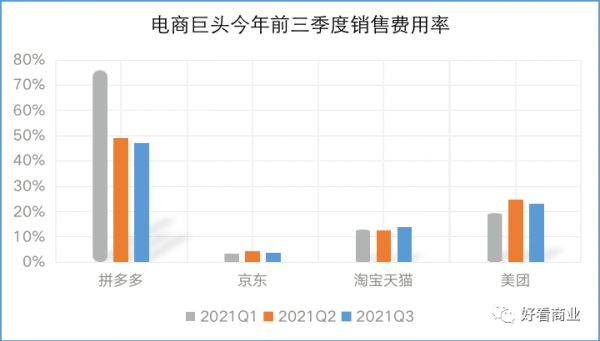 今年前三季度,一向大把烧钱,高喊“百亿补贴”的拼多多在逐步降低销售费用率。相比之下,京东、阿里和美团在加大火力。