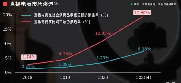 根据国金证券的研究报告显示,直播电商在电商行业的渗透率已经从2018年的1.74%飙升至了今年上半年的17.9%。