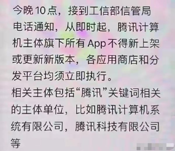 前几日,网传互联网巨头腾讯接到工信部信管局电话通知,要求腾讯旗下所有APP不得新上架或更新新版本,各应用商店和分发平台立即执行。