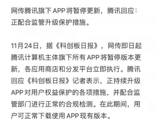 随后,腾讯回应称正持续升级APP对用户权益保护的各项措施,并配合监管部门进行正常的合规检测。在此期间,用户可正常下载使用APP现有版本。