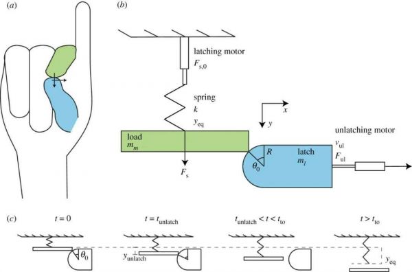 打响指是一种高速运动,其实并不只是人类掌握了这项高速运动的秘诀,很多生物体都将这种运动作为自己的生存技能,就比如当捕蝇草的叶片受到刺激时,会在大约100ms内快速闭合。因此,研究者们为这些运动开发了一个通用框架:闩锁介导的弹簧驱动系统(Latch-mediated springactuation,LaMSA)。
