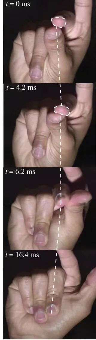 当中指“弹簧”达到平衡时,它就会达到最大速度。研究者们使用4082fps的高速成像才捕捉到了打响指的运动过程,他们发现,打响指这项动作仅需要7ms就能完成。也就是说,它比眨一次眼的时间(150ms)还要再快20多倍。