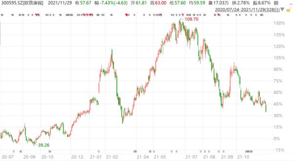 今年,欧普康视上演极致过山车行情。2月—3月,股价从92.7元一路下挫至51.2元,跌幅高达43%。然而从3月中旬到6月下旬,资金猛打猛攻,股价反弹109%,并创下历史新高。万万没想到,最近短短4个月,股价再度逼近腰斩。